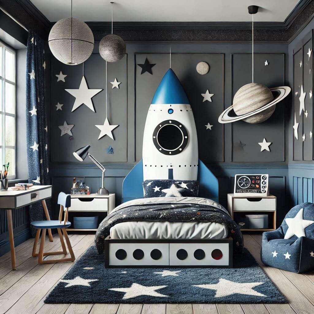 - Mobilier: Lit en forme de navette spatiale, étagères comètes, bureau fusée.