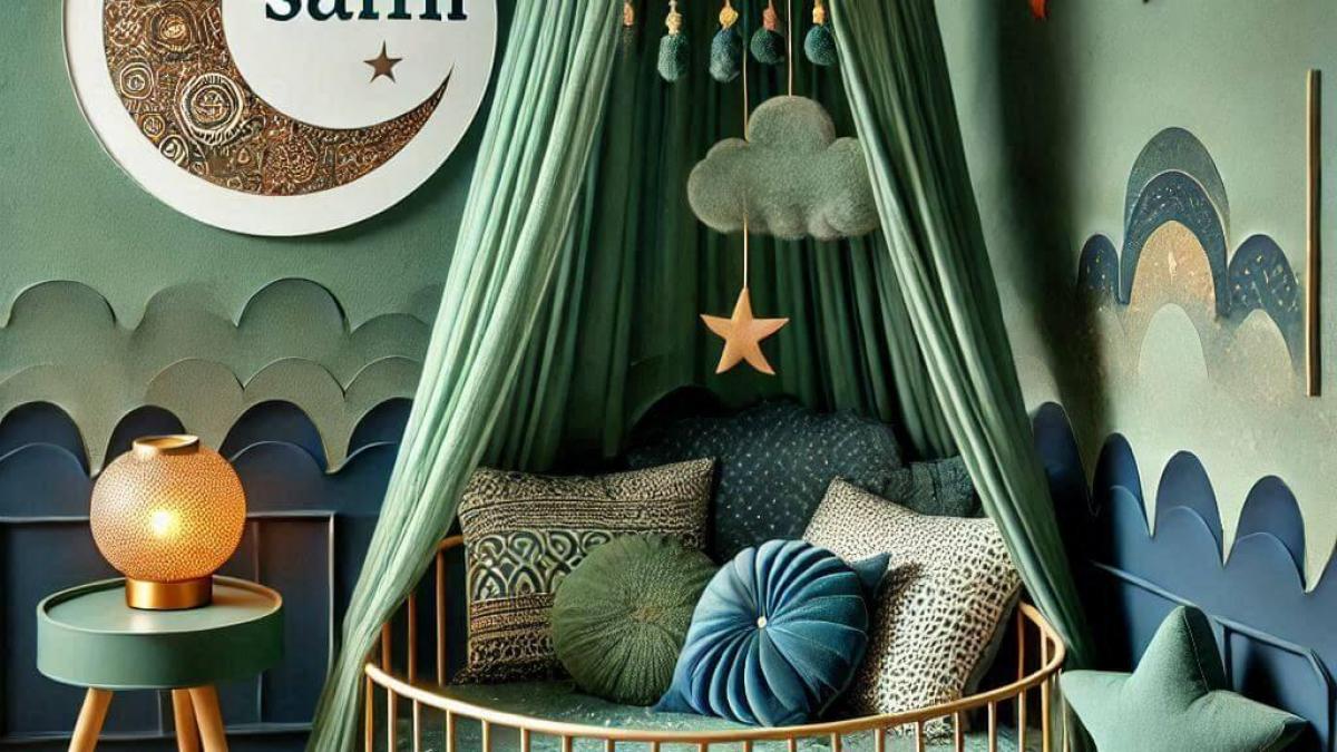 Découvrez le prénom Sami : son origine arabe signifiant 'élevé' ou 'noble', son caractère charismatique et généreux, ainsi que des idées de décoration pour une chambre d'enfant aux tons verts et bleus, avec un lit rond et un ciel de lit étoilé.
