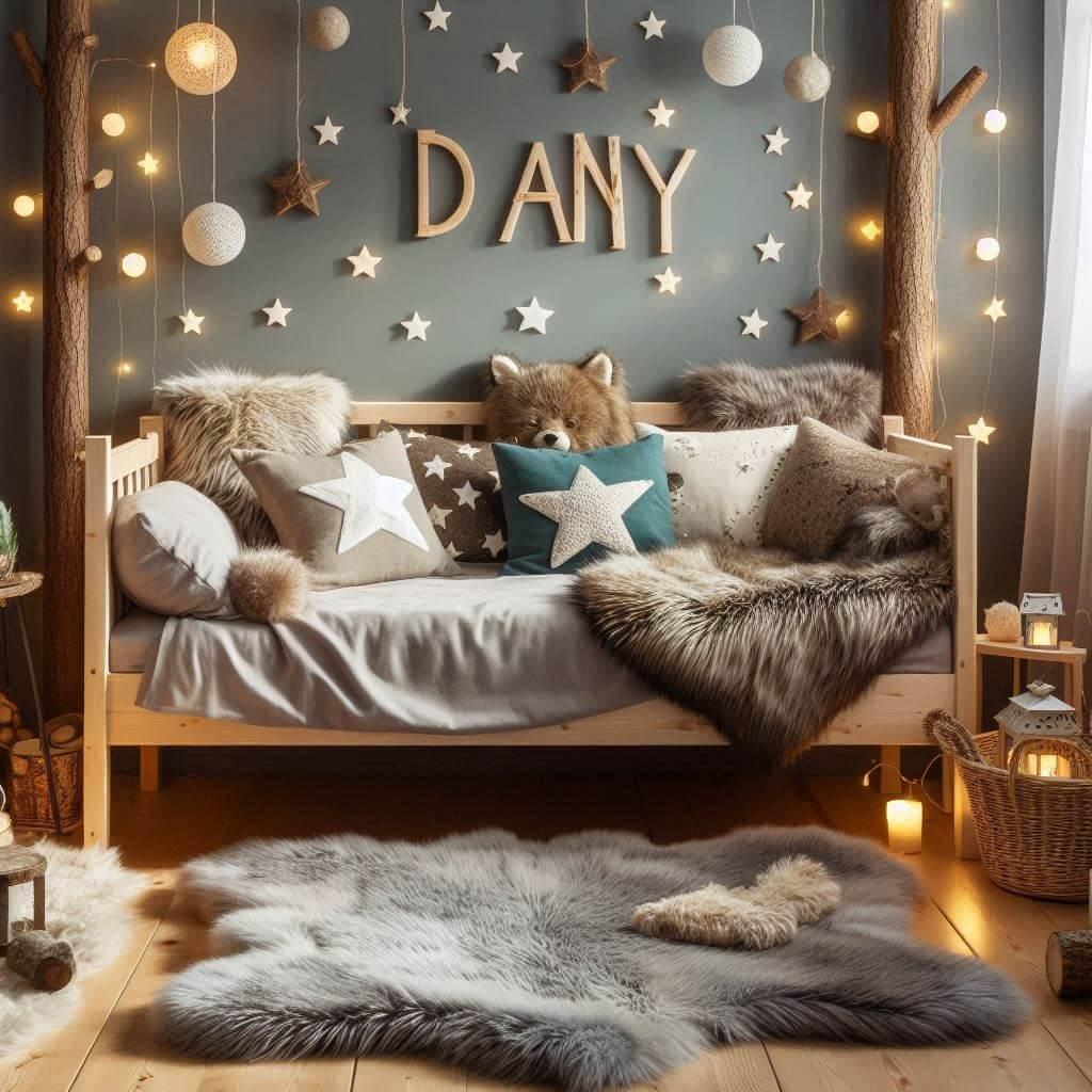 Découvrez des inspirations déco uniques pour la chambre de Dany, avec des ambiances chaleureuses et créatives telles qu'un lit cabane en rotin, des coussins brodés en forme d'étoiles et de lune, un tapis moelleux et des touches de style scandinave et bohème chic, le tout personnalisé avec le prénom Dany.