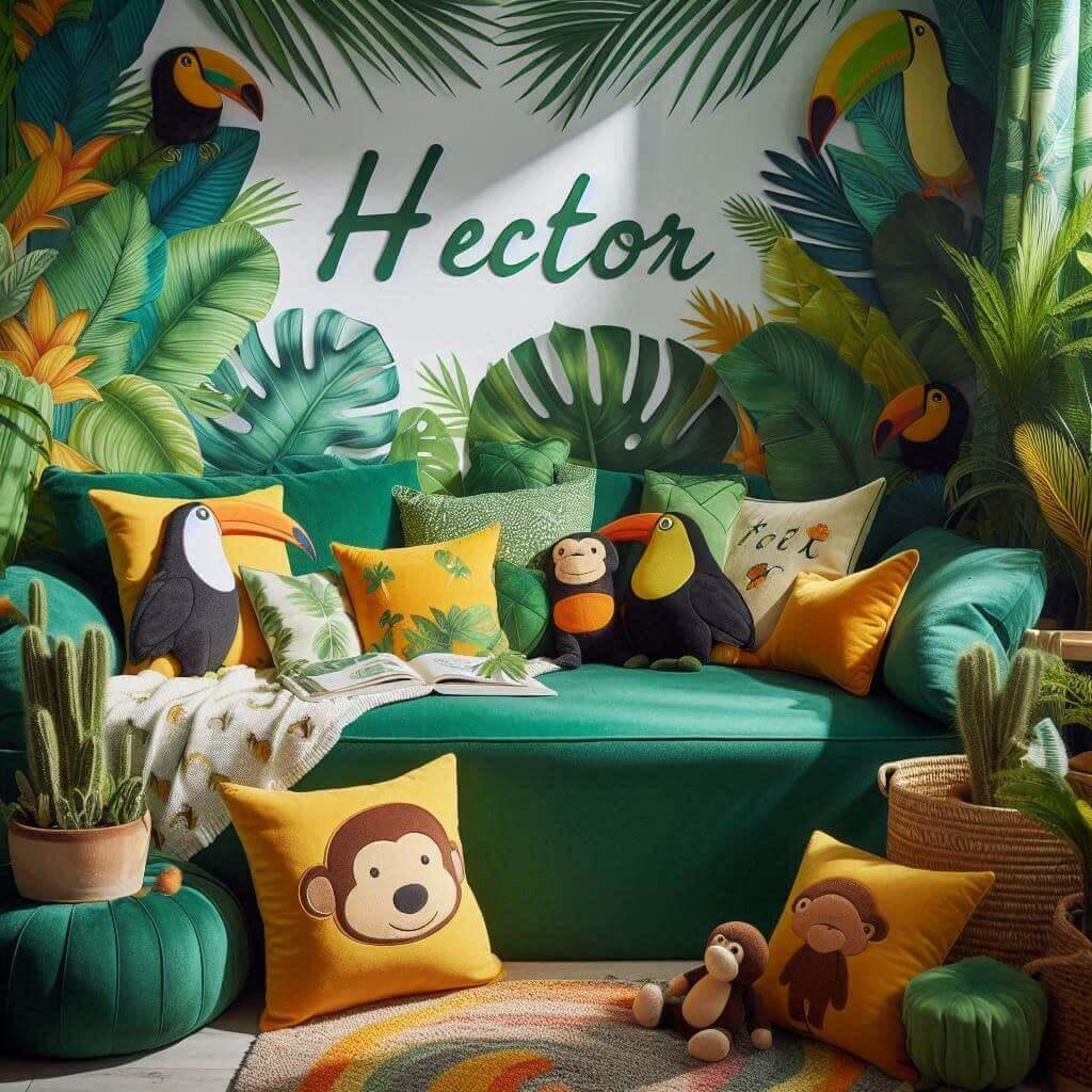 Pour une chambre d'enfant portant le prénom Hector, l'ambiance pourrait s'inspirer d'une esthétique à la fois énergique et élégante. Optez pour des couleurs puissantes et nobles comme le bleu marine, le gris anthracite et des touches de cuivre pour une atmosphère moderne et dynamique. Pour la décoration, un lit en métal aux lignes épurées, un tapis géométrique aux motifs audacieux, des coussins aux motifs de lions et une lampe industrielle apporteront une touche à la fois sophistiquée et audacieuse à la chambre d'Hector.