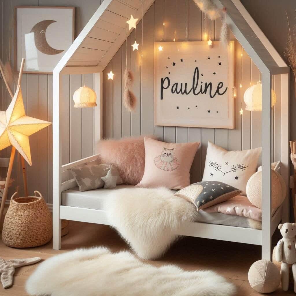 Ambiances féeriques, textiles doux et mobilier cabane : inspirez-vous de ces décors imaginés pour une chambre personnalisée au prénom Pauline, entre magie, confort et style scandinave.
