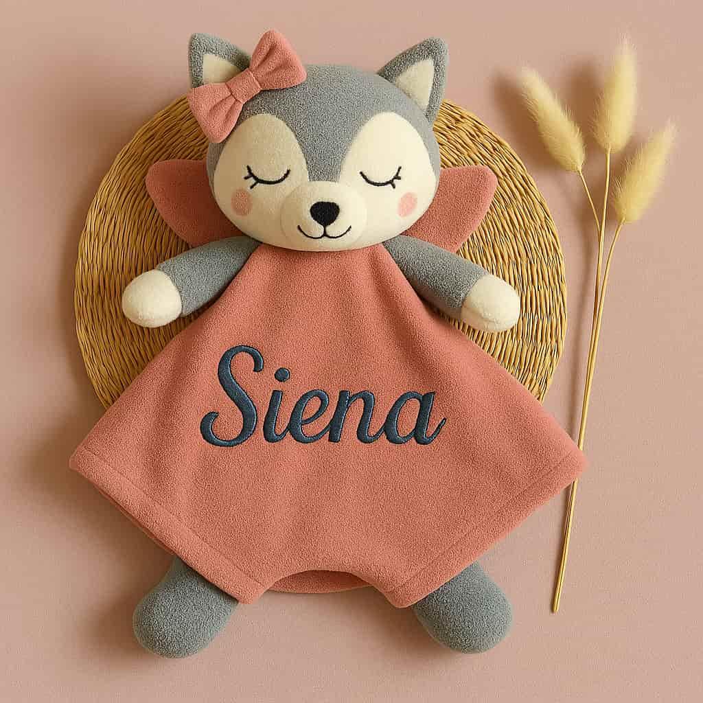 Offrez à bébé un doudou loup personnalisé avec le prénom Siena, confectionné dans un tissu ultra-doux. Ce compagnon de tendresse est idéal pour les câlins, rassurer l’enfant et ajouter une touche unique à la chambre. Un cadeau de naissance à la fois pratique et plein d’émotion.